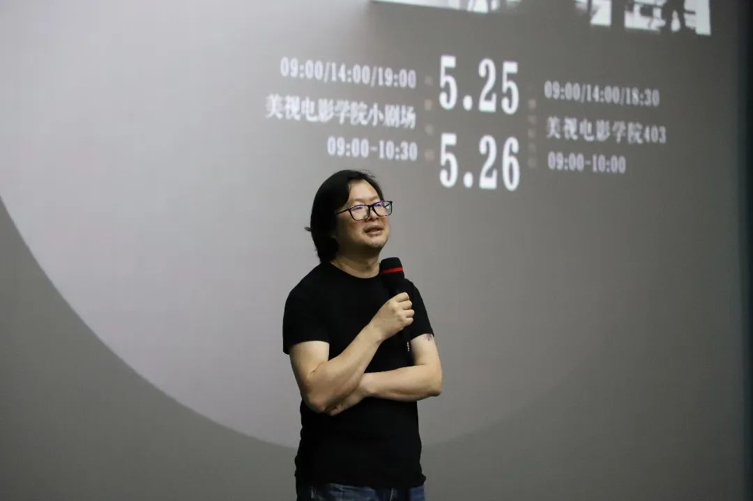 接下来,本次作品展的特邀嘉宾米家山导演对本次展映的部分作品进行了精彩点评。他首先表示,对同学们作品的完整度感到非常惊讶。同时,他也为同学们在各类题材作品上的深入探索而感到高兴。米家山导演表示,对于电影学院的同学来说,最重要的学习方式就是实践。他认为,此次作品展充分展现了同学们作为专业硕士研究生的专业实践能力,从同学们的作品中,他感受到了同学们对电影专业的钻研与热爱。随后,米家山导演对本次展映作品一一点评,从剧作、表现形式、电影语言与风格以及题材等方面进行了评析并提出建议,并与在场的创作者们进行了深入细致的交流。最后,米家山导演强调,电影就应该有属于电影的质感,同学们需要认真思考,如何表现出属于电影的特质,这是电影创作者们需要掌握的很重要的一点。
