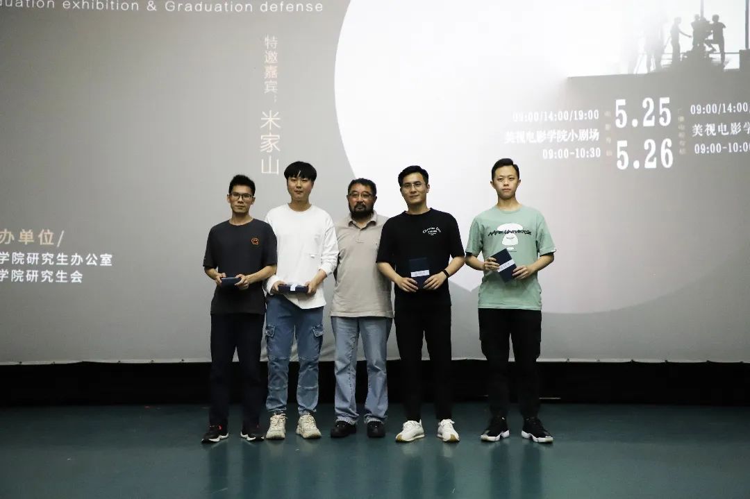 三位老师发言结束后,主持人公布了本届专业硕士生毕业作品展映活动“最受欢迎作品”的获奖名单,分别是张子坤同学的作品《宕机·错误代码》、王浩帆同学的作品《瞎了一只眼》、葛思遥同学的作品《网事说法》和彭静同学的作品《胡家村的人和事》。米家山导演作为颁奖嘉宾为获奖的四位创作者颁发获奖纪念品。最后,在场师生进行了合影留念,本次活动圆满结束。