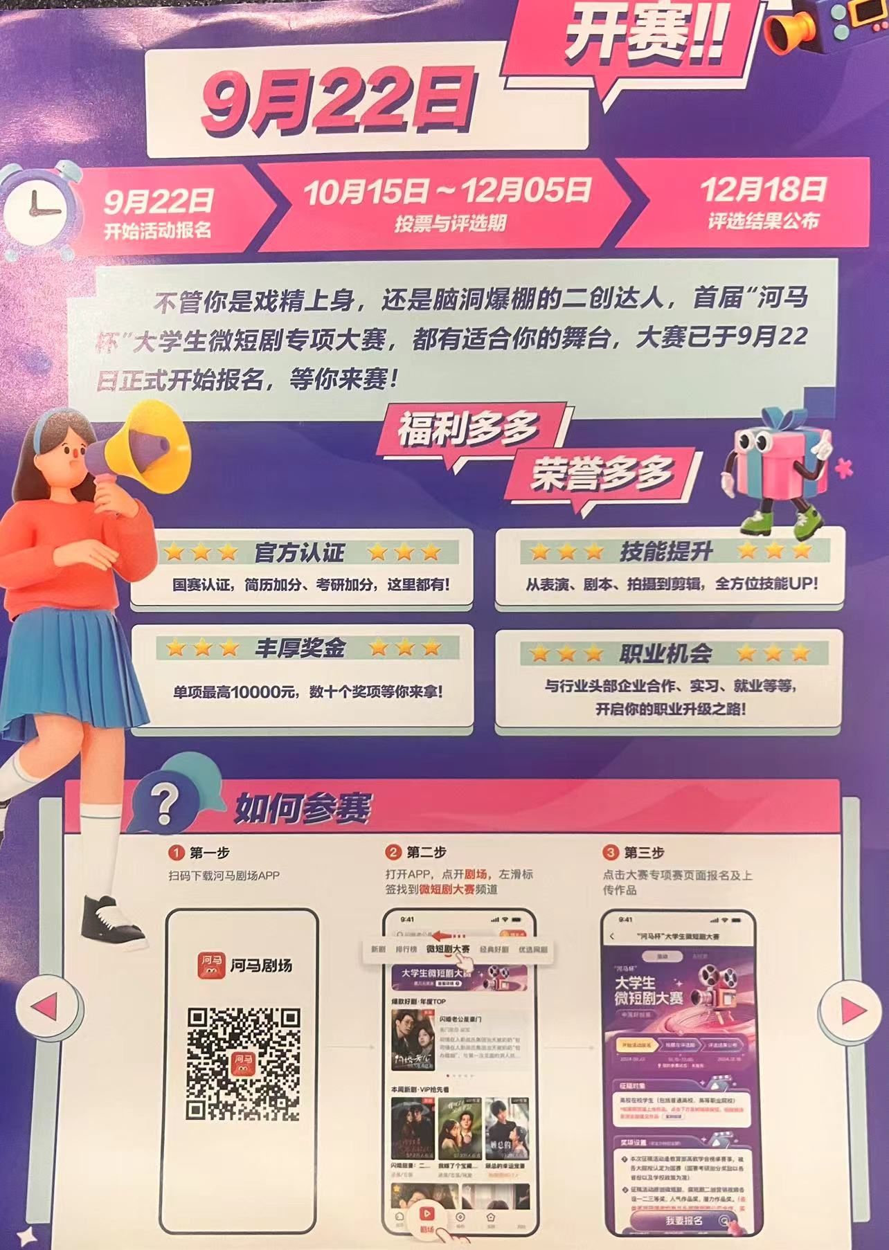 本届大赛包括原创微短剧、微短剧二创营销视频两个参赛类别,各设一二三等奖、人气作品奖,潜力作品奖等。大赛评审分为初评和终评两个阶段,来自中国传媒大学、北京大学、中国人民大学等高校的专家学者和业内专家组成具有公信力、权威性的专家评审团,共同评选出优质的精品内容。整个赛事周期将持续近3个月,为参赛学生提供充足的创意策划和视频制作时间。