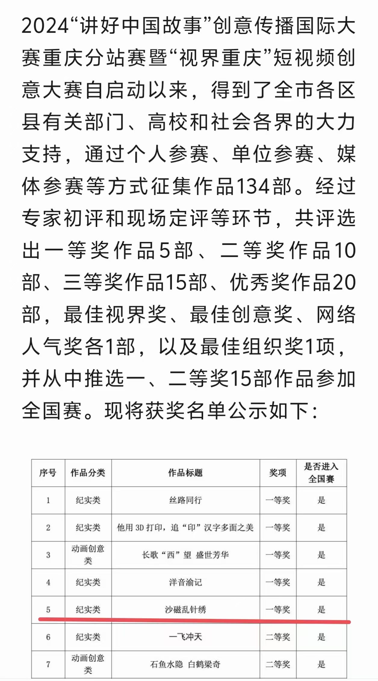 院长助理、影视系副教授王琦指导,21级戏剧影视文学专业朱培阳、22级戏剧影视文学专业涂诗怡、22级戏剧影视导演专业王舒雅、22级戏剧影视文学专业徐子微和23级表演专业朱恬莹联合创作的中英双语非遗题材纪录短片《沙磁乱针绣》荣获一等奖,并将代表重庆冲击全国总决赛。
