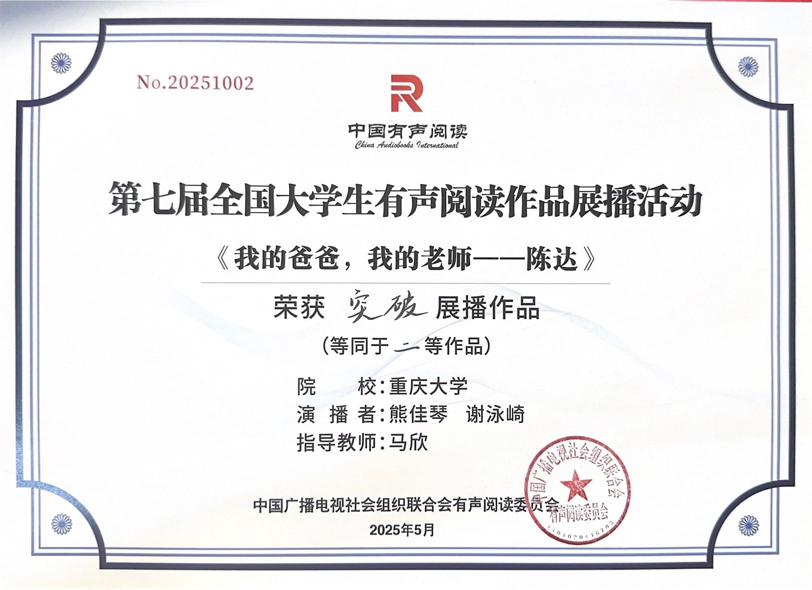 2025年5月24日,第七届全国大学生有声阅读作品展演活动在天津传媒学院顺利举办。本次比赛由中广联合会有声阅读委员会、浙江教育出版集团、天津传媒学院主办,中广联合会有声阅读委员会高校工作部、天津传媒学院播音主持艺术学院承办。比赛自2025年4月启动以来,吸引了全国100余所院校的广泛参与,收到了千余件作品。经过初选,共有60支展播团队齐聚天津传媒学院进行现场展演,参与院校规模、作品数量再创新高。经专家评审,porn网站 播音主持系作品《我的爸爸、我的老师—陈达》(2022级学生谢泳崎、熊佳琴)晋级全国总决赛,经过激烈角逐,最终获得第七届全国大学生有声阅读大赛二等奖。