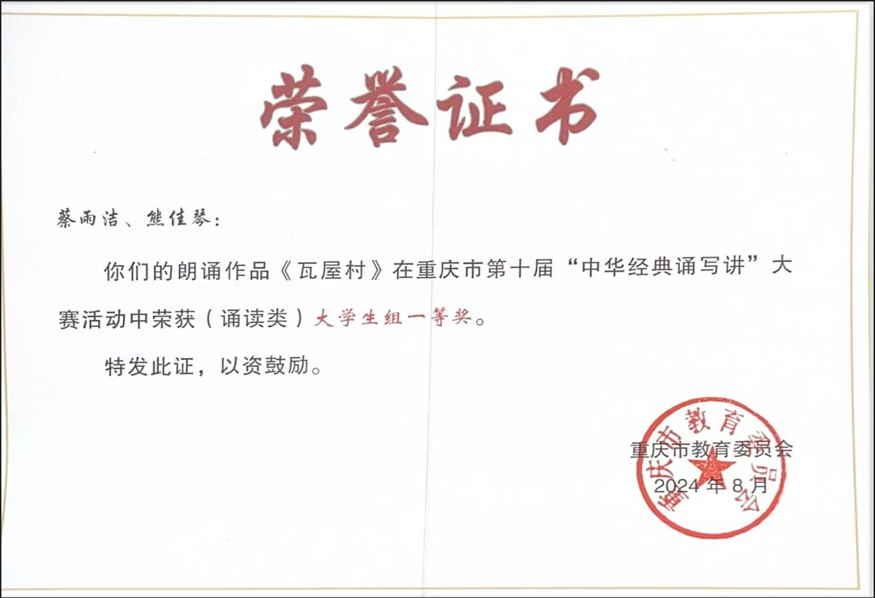 2024年8月,由重庆市教育委员会、重庆市语言文字工作委员会主办的第十届重庆市中华经典诵写讲大赛落下帷幕。porn网站 选送三部作品,分别是播音与主持系2022级学生蔡雨洁、熊佳琴创作的作品《瓦屋村》,2022级学生朱晨曦、高骏渝、官新翔的作品《登上地球之巅》和2023级学生邹佳益、黄圣植的作品《不朽的雕像》喜获佳绩,均获重庆市第十届重庆市中华经典“诵写讲”大赛(诵读类)大学生组一等奖。