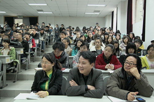 接着,他提出格物致知,创造艺术不能仅仅做到贴近与深入生活,不能仅仅追求自然主义,而是应该入乎其内,又须出乎其外。对于如何做到这一点,他说到首先创造艺术的人先要完善自身,提高自身文化素质,使自身得到全面发展,再通过艺术达到养眼养心,最终将养眼与养心深化创造出真正的艺术。其间,他以《蜗居》实例为我们讲述当代艺术的弊端,即刻意的追求真实与实际,而忘却了讲求哲学。他强调对待艺术我们同样要运用哲学的辩证思维,使艺术作品得到升华。