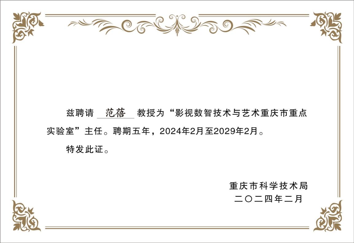 和大数据与软件学院共建的“数字影视艺术理论与技术重庆市重点实验室”根据工作需要成立了由实验室主任范蓓教授担任组长,实验室副主任杨尚鸿教授、刘礼教授等组成的优化重组方案编制工作组。工作组结合实验室近年来的建设情况,制定了详细的优化重组方案。经过半年多的努力,于2023年12月的答辩中,顺利通过评审。结合专家建议以及实验室未来发展规划,实验室申请更名为“影视数智技术与艺术重庆市重点实验室”并获得通过。近日,重庆市科技局为各重点实验室统一制作了铭牌,并颁发了实验室主任聘书。