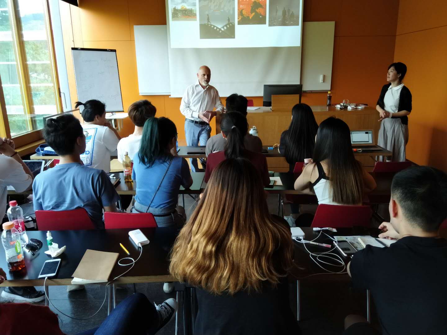 院长助理王琦带队,成员中包含10名研究生和2名本科生。访学团的第一站是位于瑞士南部卢加诺市的瑞士意语区公立大学。该校传播科学学院为访学团的同学们安排了内容丰富的理论课程。副院长马修·希伯德教授作了关于欧洲媒介经济与政治的讲座;中国观察中心主任加布里埃尔·巴尔比教授作了关于欧洲数字媒体发展历史的讲座;伊劳诺拉·贝内奇研究员作了关于电影粉丝文化的讲座;格劳瑞亚·达尼诺研究员讲授了关于欧洲电影工业政策的相关知识,张展研究员就当下中国电影与欧洲的关系进行了深入分析。几场专业的讲座不仅开阔了访学团成员们的眼界,还极大地提升了大家的英文听说水平。