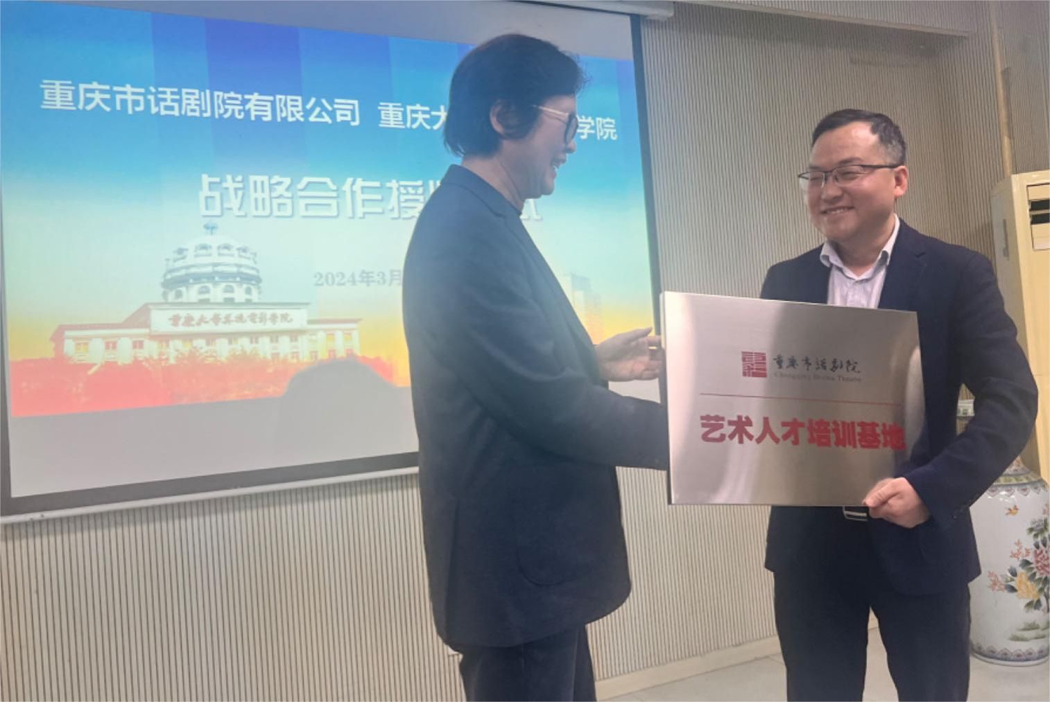 是培养艺术人才的沃土,艺术人才培训基地挂牌学院,对话剧院的发展定会有更好的推动作用。重庆市话剧院是重庆市唯一的市级专业话剧艺术剧院,拥有抗建堂剧场、拾楼戏剧空间和全国唯一的抗战戏剧博物馆。希望以本次授牌仪式为契机,将框架协议相关内容落到实处,通过一个个项目的落地,真正实现双方资源共享,优势互补,深入推进重庆市话剧艺术事业的较好发展,增强学校教育与艺术创作实践之间的紧密联系。