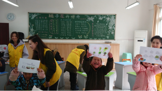 在教导完孩子们画树之后,孩子们争先恐后地将自己的绘画成果一一向志愿者们展示,以求得这些大哥哥大姐姐的夸赞。